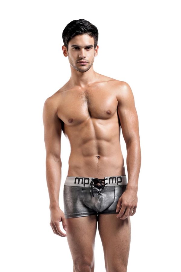 Mini short with lace up pouch, satin logo’d plush waistband.80% Nylon 20% Spandex