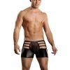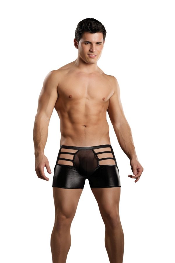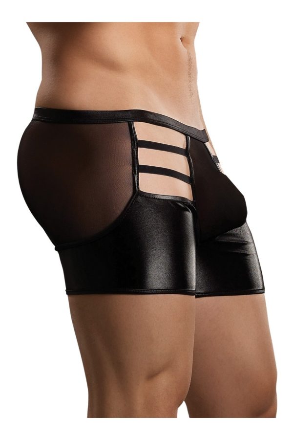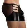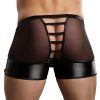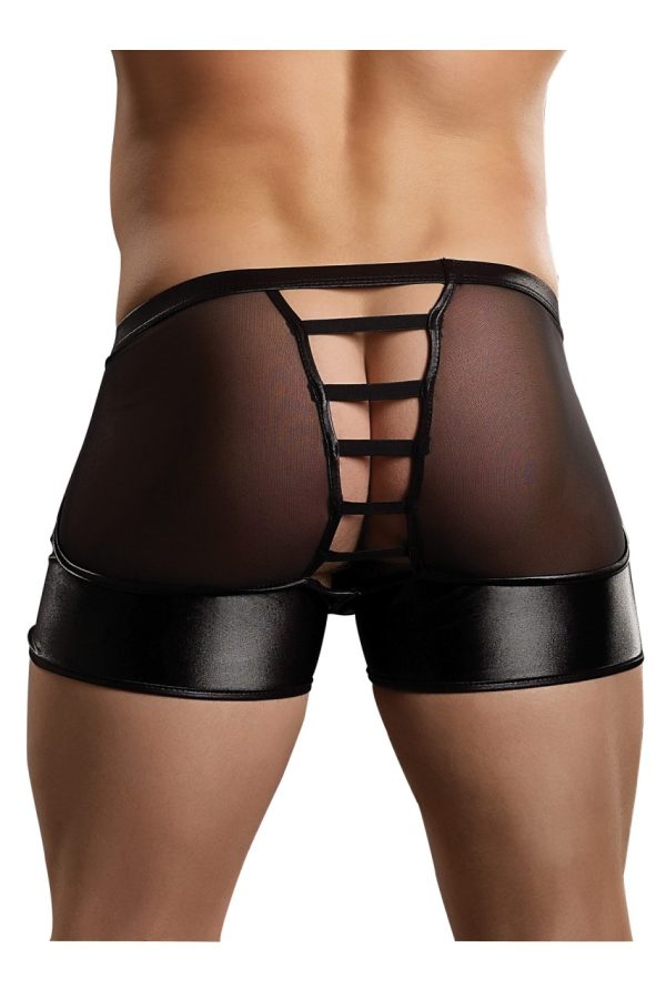Leather look cire paired with stretch mesh features a 4 way stretch poly spandex blend.