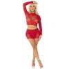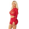 Turn up the heat in and out of the bedroom in this sexy two piece rhinestone set. Featuring a lace and net crop top with a heart motif on the back and matching mini skirt.