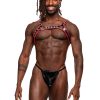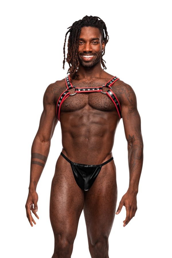 From the Leather collection by Male Power, this style includes a chest harness with over the shoulder straps and criss cross back straps, fully adjustable with metal snaps. Soft Nubuck Leather with Polyurethane coating, heavy metal rings, buckles, and studs and snaps. Do Not Wash, Do Not Bleach, Do Not Tumble Dry