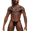 From the Leather collection by Male Power, this style includes a chest harness featuring an oval front opening with metal rings, fully adjustable buckled straps, metal studs. Soft Nubuck Leather with Polyurethane coating, heavy metal rings, buckles, and studding. Do Not Wash, Do Not Bleach, Do Not Tumble Dry
