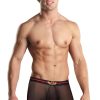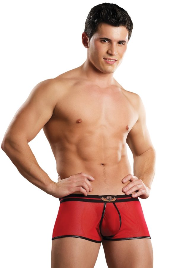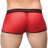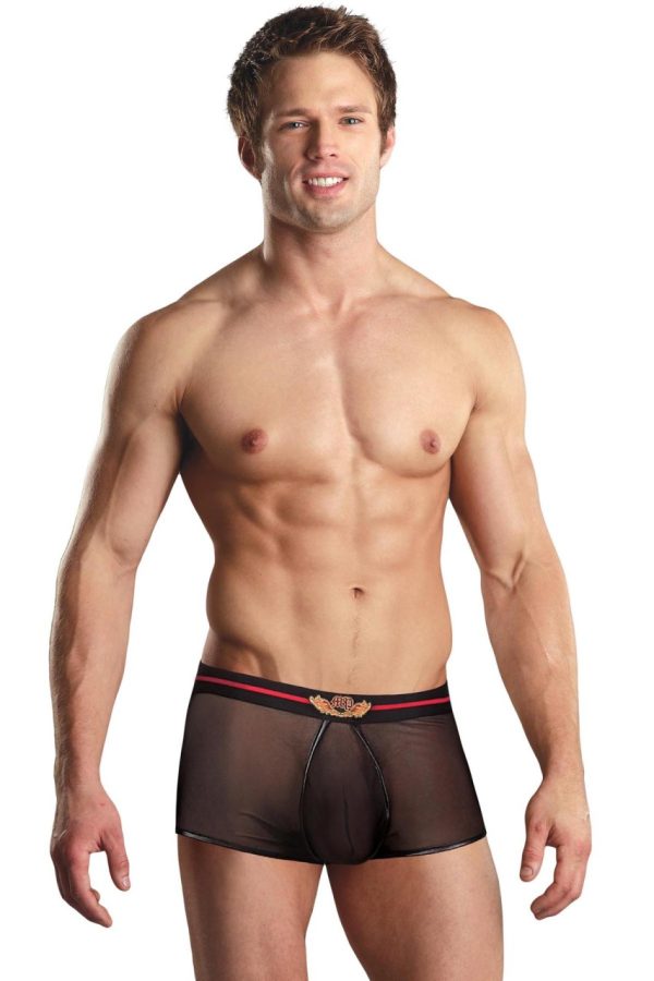 Sheer mesh low rise short features enhancing comfort fit pouch, plush elastic waistband with classic wings emblem and contrasting plush elastic trim
