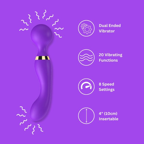 This dual-ended vibrator features 20 functions and 8 power modes, with a vibrating head and an insertable handle for versatile stimulation. To use, press and hold the up or down arrow for 3-5 seconds to turn on/off, press the arrow to adjust speed and press the power button to change modes. Features: