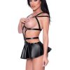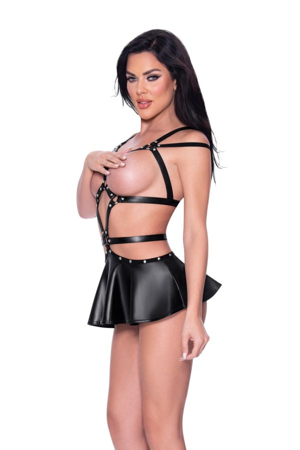 From the Lust Fetish collection by Magic Silk, this style includes: a Cage Mini Dress and Open G string set features a caged strappy top and circle skirt bottom nickel plated studs,rings and clip closures, adjustable back straps. 85% Polyester 15% Spandex