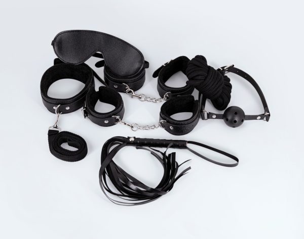From the PU leather accessories collection, this style features a 7 Pack Lite Bondage Set and includes an adjustable faux fur lined Collar with Leash, Cat o’ Nine Tails Whip, Soft Stretch 15′ Rope, Adjustable faux fur lined Wrist Cuffs, Lightly lined Eye Shades with elastane head band, Adjustable Faux Fur lined Ankle Cuffs, Adjustable buckled Gag Ball. Metal Belt Buckles, Rings and Studs adorn most styles. Polyurathane coated split Nubuck leather