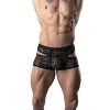 From the Lucifer collection by Male Power, the Cut Out Short has high cut legs, pouch enhancing trim, and a cut out window throughout the hip area secured by two straps in back, allowing for a glimpse of butt cleavage.