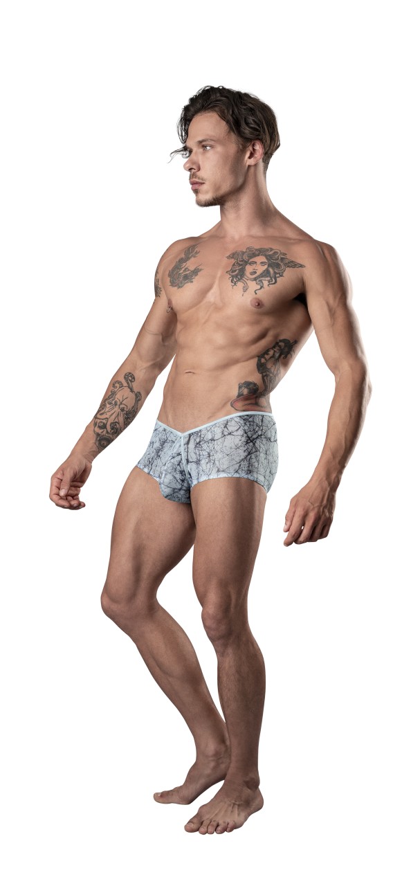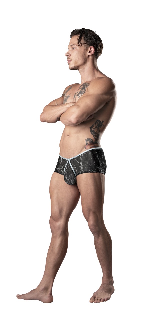 From the Marble Mesh collection by Male Power, the Micro Mini Short has extremely high cut legs, a low cut waist and an enhanced pouch. It is trimmed with a satin finished stretch binding.