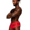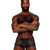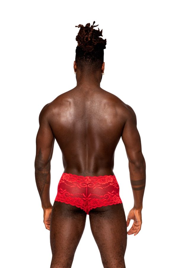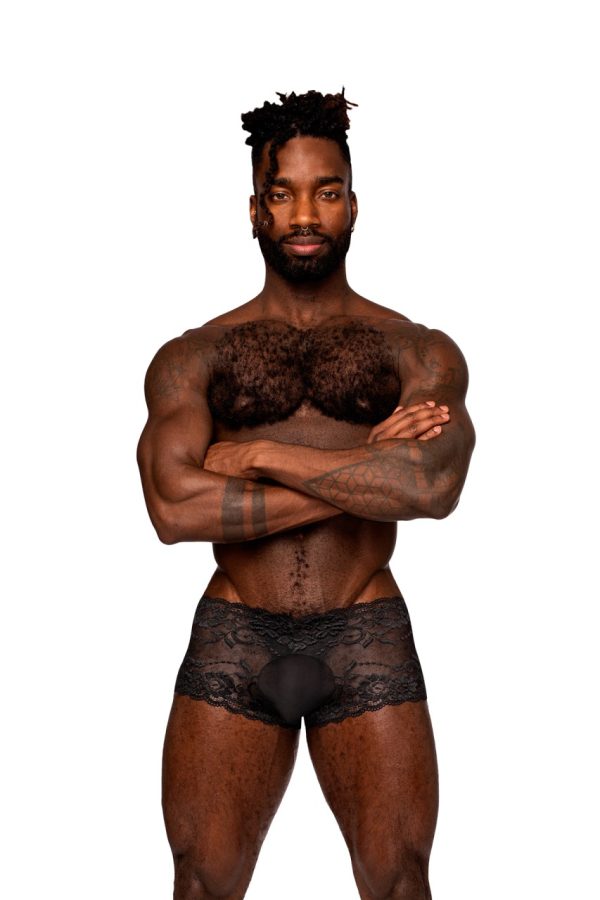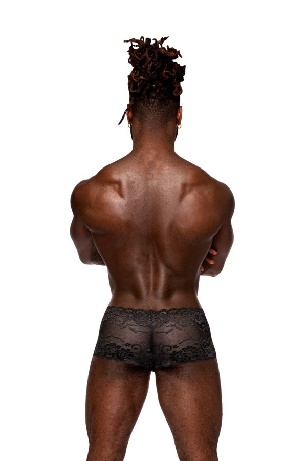 From the Sassy Lace collection by Male Power, the Mini short sheer pouch features a low cut scallop edged waist, high cut scalloped edged legs and a sheer mesh see thru pouch.