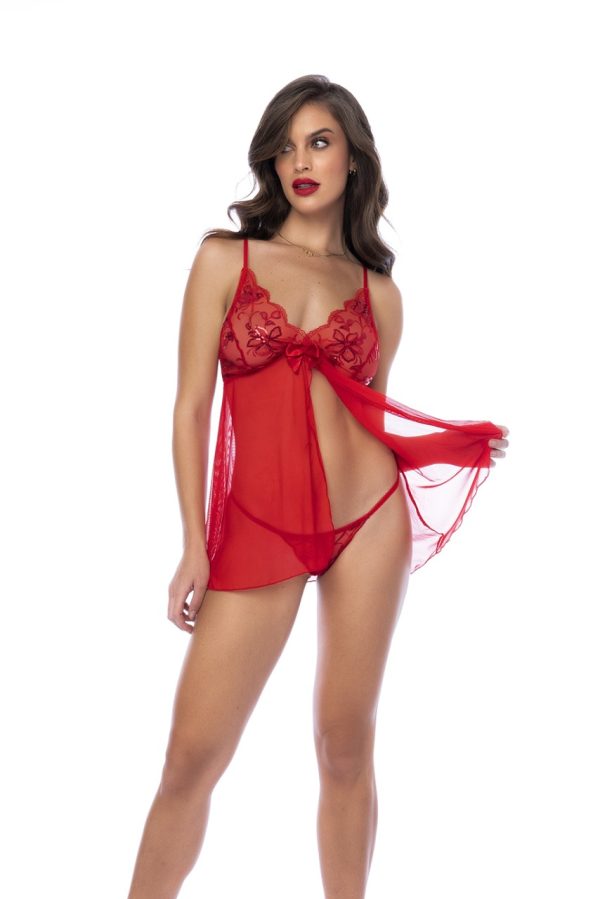 Sequins, floral design and seductive transparency. Your new favorite for any occasion, includes front opening, adjustable straps, matching thong. Loose silhouette.