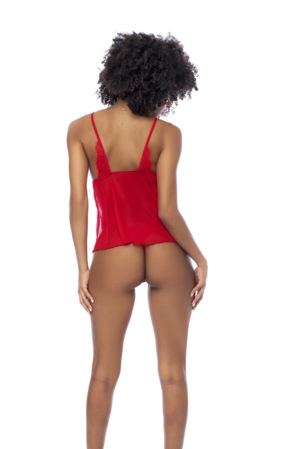 The perfect mix of simplicity and romanticism. Babydoll in eyelash lace and stretch mesh contrasts, adjustable straps and matching thong. Loose silhouette.