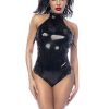 Radiate all your power in this vinyl bodysuit with halter neckline, side eyelet lace-up details, thong coverage and adjustable crotch fastening.