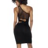 Style your figure with this asymmetrical dress including cut-outs and ring detail in a stretchy fabric with sheer mesh contrast in the back.