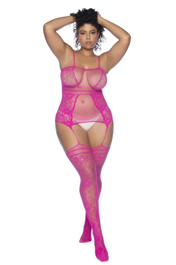 Accentuate your curves with this mesh design and floral details, with a garter belt and attached stockings.