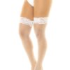 Fishnet thigh high stocking with lace band and internal silicone to prevent slipping.