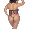 A versatile fishnet bodysuit that can be styled with either a halter or crossed neckline. It features front floral details and an alluring lace-up design at the back.