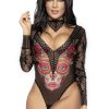 Sexy Catrina costume. Includes printed mesh bodysuit with floral lace back and sleeves, lace collar and head piece.