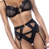 This three-piece set is sensuality at its fullest. Includes underwire top with adjustable straps, matching wet-look and sheer mesh contrast thong and garter belt with ring details.