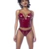 Two-piece vinyl set in an iconic color. Includes bustier with underwire for greater support, functional zipper closure in the back, adjustable straps and matching thong.