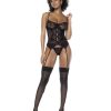 Two-piece lace set. Features a flirty bustier with satin bow details, adjustable straps and built-in garter belts. Matching thong.