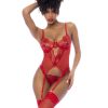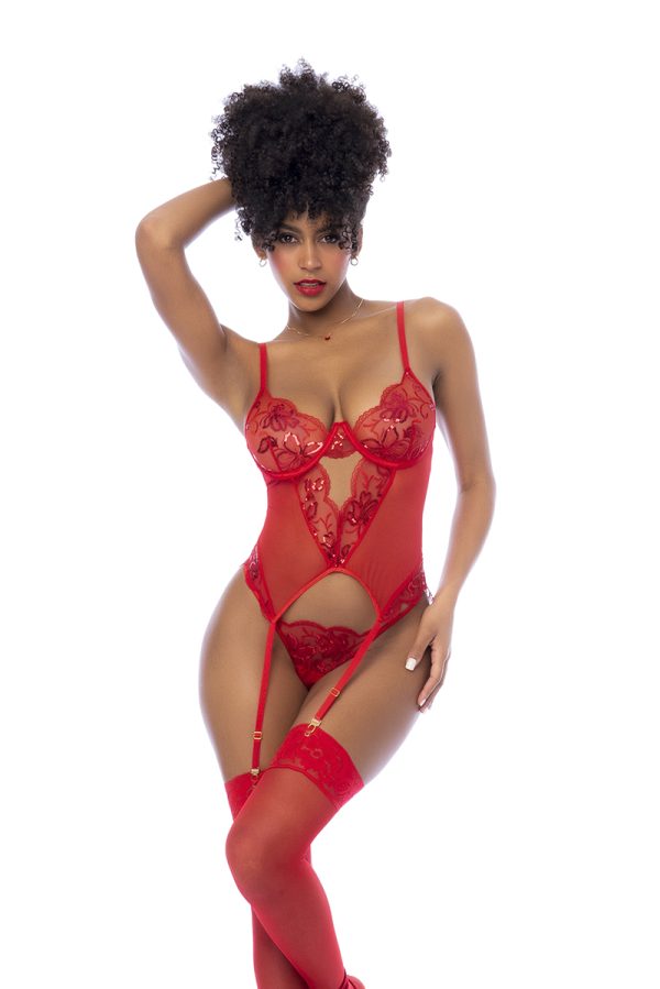 This two-piece set screams passion. Featured in a sequin embroidered mesh, Includes a bustier with underwire, lace-up back design, adjustable shoulder straps and matching thong.