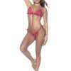 This playful two-piece bikini in an eyelet print features adorable ruffle details, with a front-tie top and a matching thong bottom.