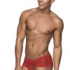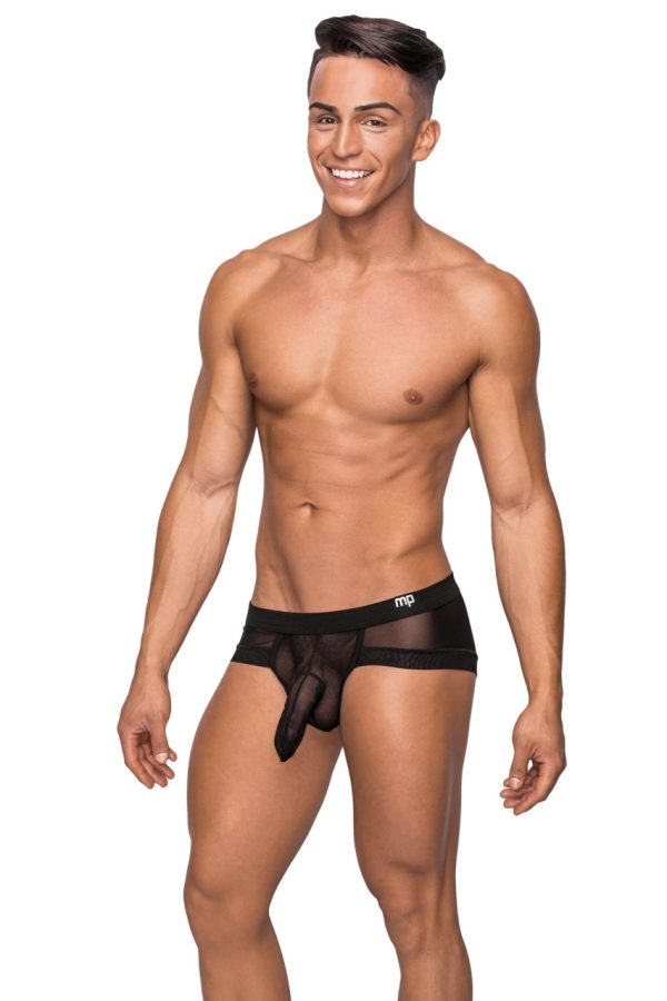 Micro mini short, low rise waist, ultra high cut legs, plush cotton waistband, stamped logo, shaft pouch