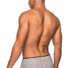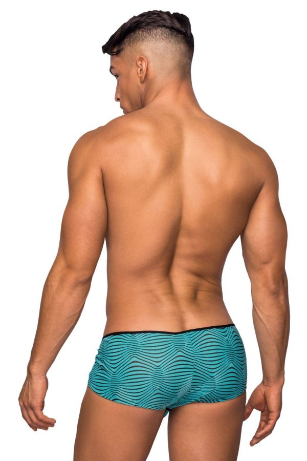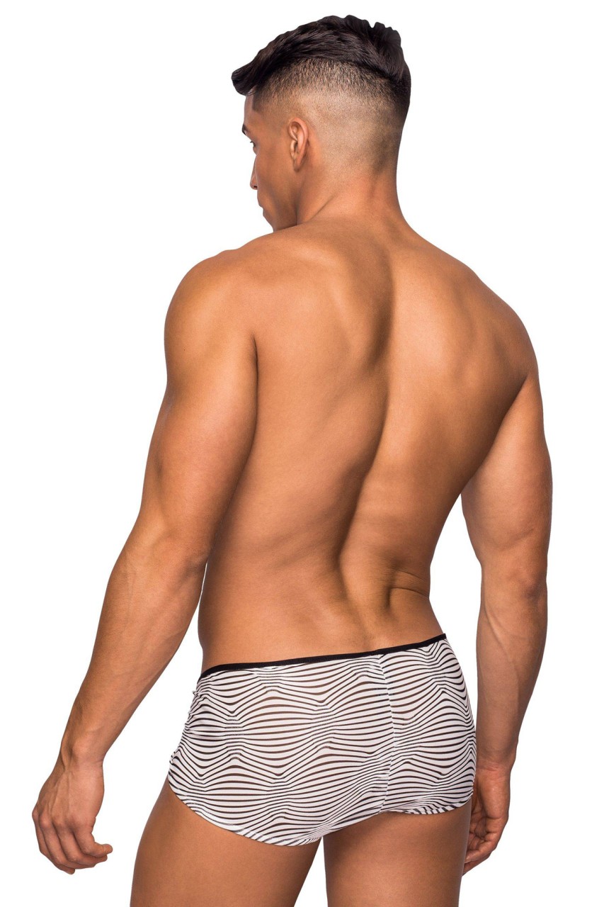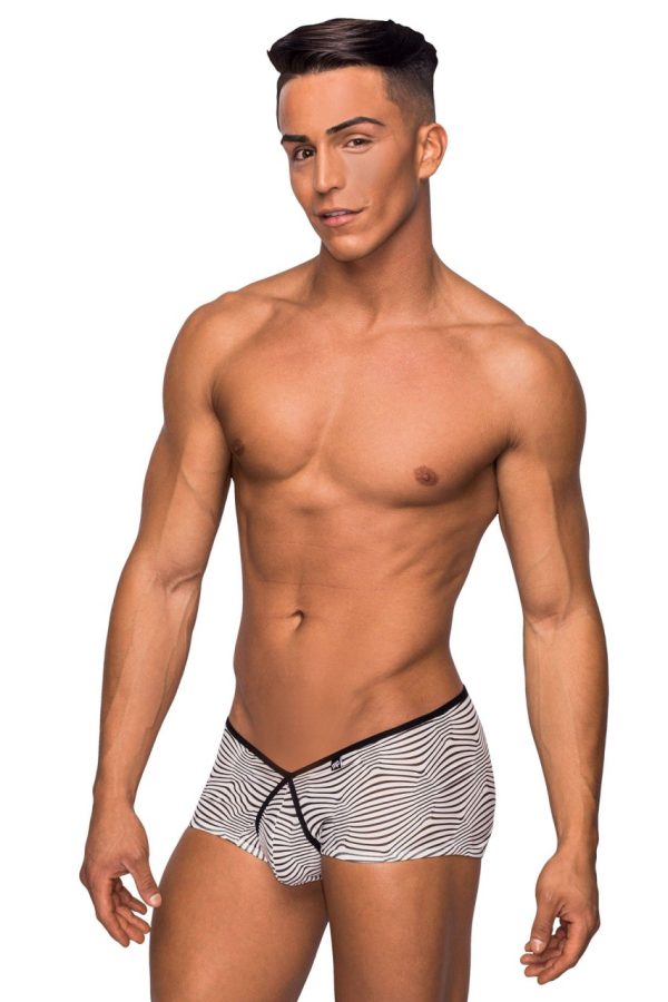 Micro mini short, ultra low cut waist, high cut legs, enhancing nylon trim on waist and pouch