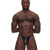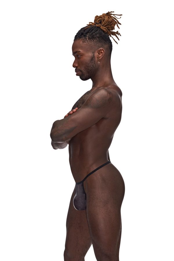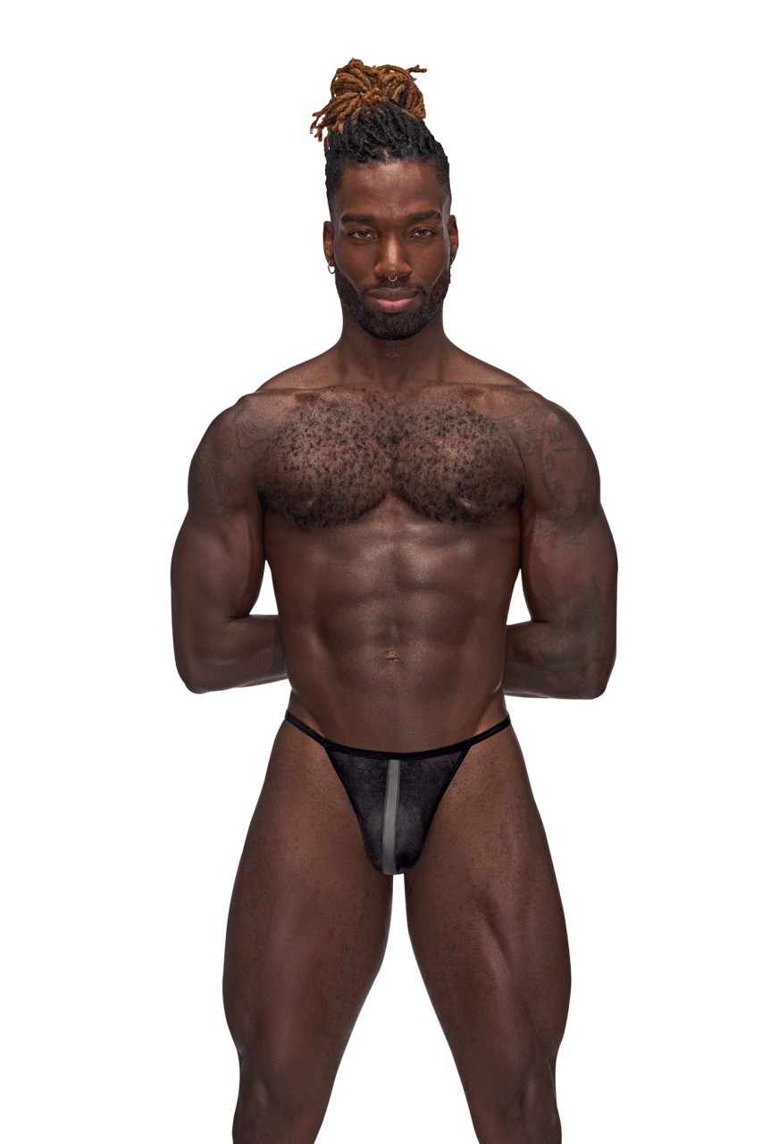 From the Landing Strip collection by Male Power, the Micro Thong features a thin plush elastic trimmed waistband, a tone on tone matte onyx insert strip through the pouch, and a decorative metallic brand label on rear waistband. Sheer stretch mesh poly spandex with a stretch faux leather insert and plush elastic trim. Hand wash separately, cold water, line dry, no bleach