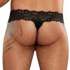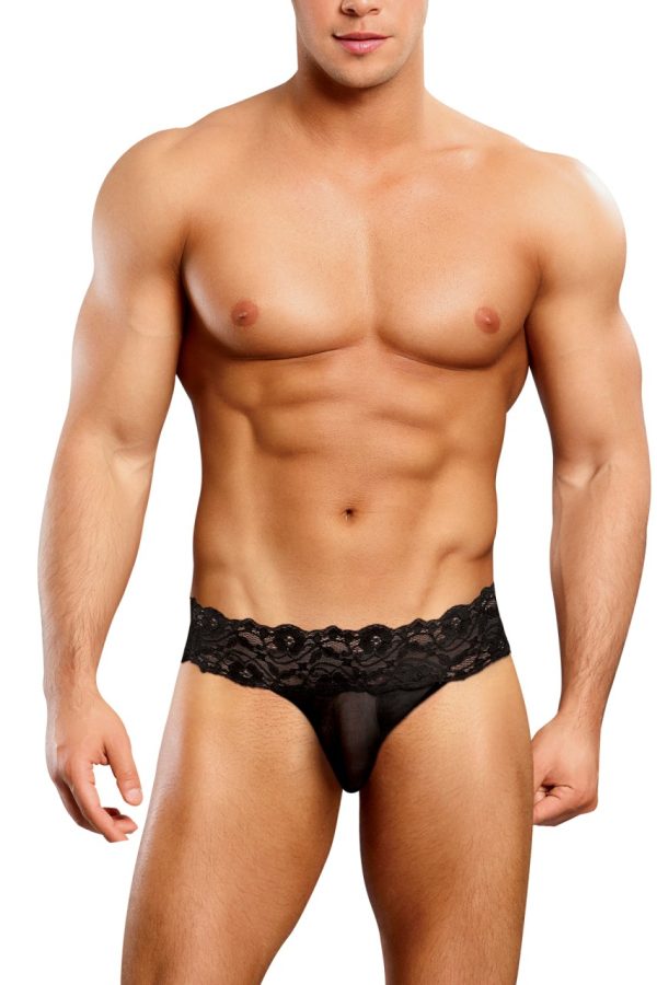 Lace micro thong features mesh pouch with cire trim, thick floral lace waistband and pinched lace thong back.