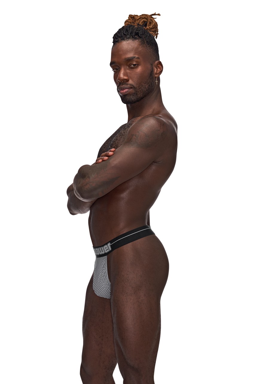 From the Sexagon collection by Male Power the Micro V Thong features a full front pouch for complete coverage, fabric insert in back of the plush branded printed waistband, 1 inch rear thong strap. Poly spandex hexagon print fabric with micro pin hole perforations for moisture wicking and cool breathability, plush branded elastic waistband. Hand wash separately, cold water, line dry, no bleach