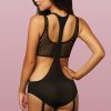 Microfiber bodysuit with attached fishnet bralette, plunging neckline, racerback, removable industrial garters, and snap crotch