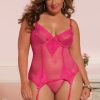 Fence mesh and floral galloon lace bustier, lightly padded underwire cups, shiny stretch satin covered boning, hook and eye closure, adjustable straps, lace overlay detail, satin tuxedo bows, removable garters, and thong
