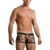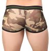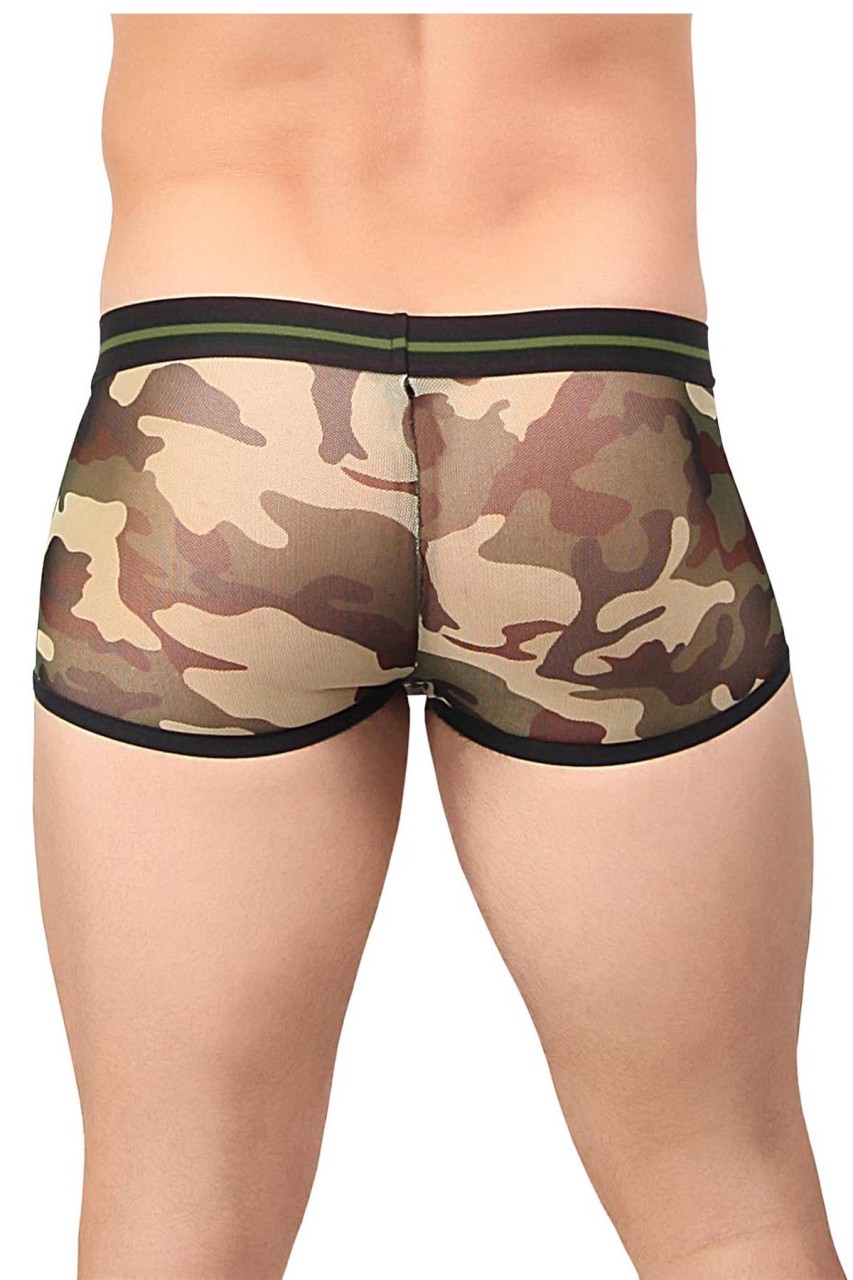 Sheer Camouflage mini short features comfort fit pouch, plush elastic waistband with skull emblem and contrasting plush elastic trim.