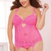 Two piece bustier set. Crochet lace bustier with underwire molded cups, strappy details, gold tassel charm, satin covered channeling, adjustable straps, gold hardware, hook and eye back, removable garters, and thong