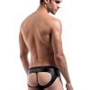 Bikini brief with open back, cut out hip, plush elastic trim and decorative brass buckle.