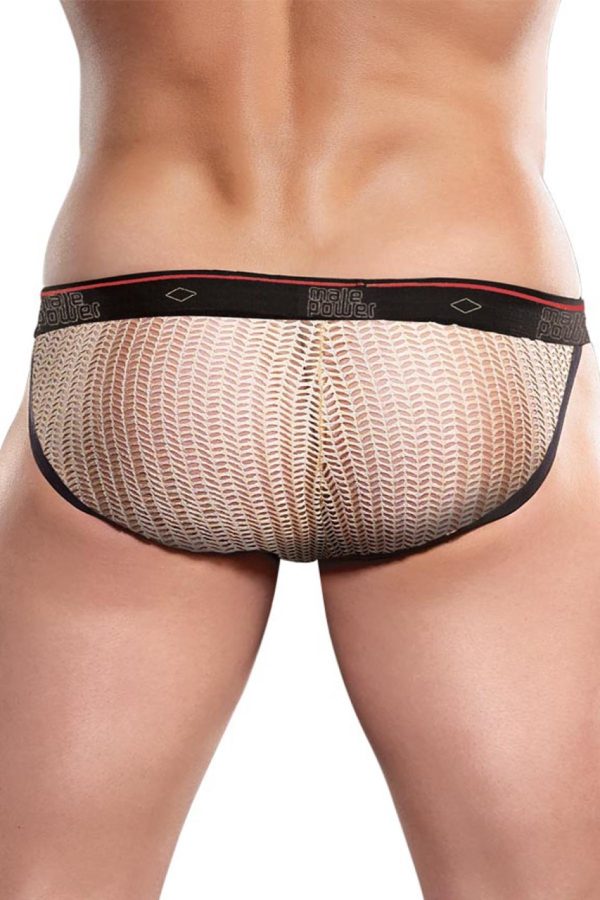 Crocheted mustang bikini features classic pouch with brief back, sexy open sides and Male Power branded plush elastic waistband and plush elastic trim.