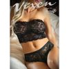 Very daring bra and open string set designed to flatter the lines of the figure and leave nothing to the imagination! Made with elastic straps and decorated in bows adorned with beautiful rhinestones. Garter included. Gloves not included. This item arrives packed in a Provocative box.