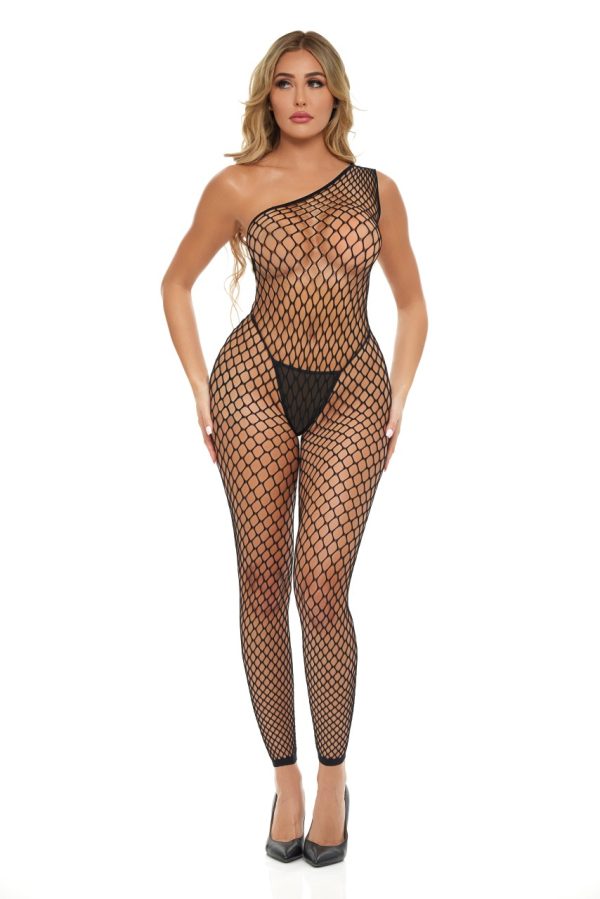 An all over holey design! This plus size bodystocking has three quarter sleeves and arrives packaged in a box. Please note thong is not included.