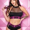 Very daring bra and open string set designed to flatter the lines of the figure and leave nothing to the imagination! Made with elastic straps and decorated in bows adorned with beautiful rhinestones. Garter included. Gloves not included. This item arrives packed in a Provocative box.