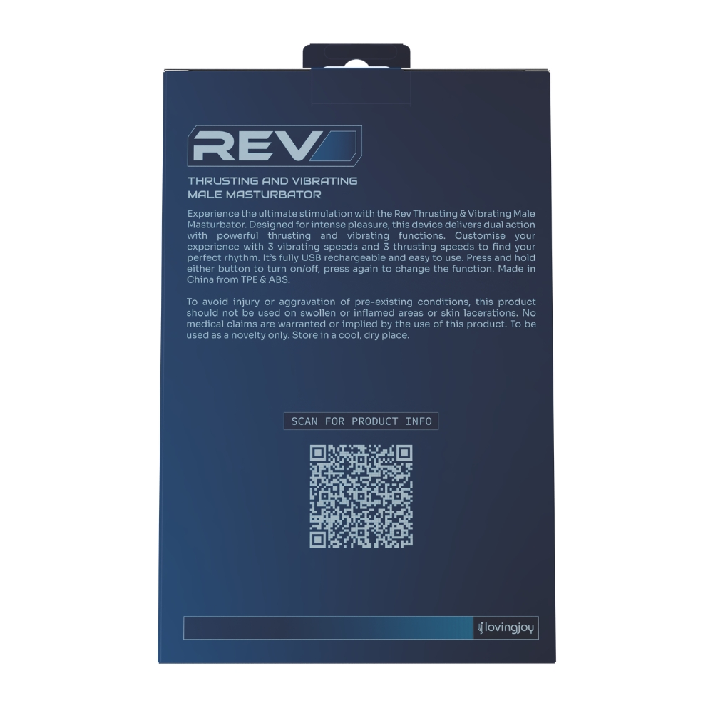 Prepare to embark on a journey of unparalleled pleasure with the REV Thrusting and Vibrating Male Masturbator. This revolutionary device is meticulously designed to take your solo experiences to extraordinary levels of ecstasy, combining the power of thrusting and vibrating sensations to create an unforgettable encounter that will leave you craving for more. Crafted with premium materials and expert craftsmanship, the REV Masturbator boasts a sleek and ergonomic design that fits comfortably in your hand, allowing for effortless control and manipulation. Its soft inner sleeve is luxuriously textured, designed to simulate the sensations of real intimacy. Featuring dual-action technology, the REV Masturbator is equipped with both thrusting and vibrating capabilities. Prepare to be captivated as the device’s powerful motor effortlessly delivers deep, rhythmic thrusts that mirror the sensations of passionate lovemaking. Experience the ultimate pleasure as it moves with precision, stroking and caressing you in ways that will leave you breathless. But that’s not all—the REV Masturbator also features intense vibrating sensations to take your pleasure to new heights. With multiple vibration modes and adjustable intensities, you have complete control over the levels of stimulation you desire. Allow the powerful vibrations to reverberate through your entire being, electrifying your senses and unlocking sensations you never thought possible. Navigating through the REV Masturbator’s functions is easy, thanks to its user-friendly control panel. You can effortlessly switch between thrusting and vibration modes, and adjust the speed and intensity to create your customised pleasure experience. The device is conveniently rechargeable via USB, ensuring that you never have to interrupt your pleasure due to battery limitations. Maintaining the hygiene and longevity of your REV Masturbator is effortless. The removable inner sleeve makes cleaning a breeze, allowing you to keep your device in pristine condition for countless sessions of pleasure. Indulge in a world of limitless pleasure with the REV Thrusting and Vibrating Male Masturbator, as this handheld device is engineered to elevate your solo experiences, offering a combination of thrusting and vibrating sensations that will leave you in a state of pure bliss. Unleash your deepest desires and embark on an unforgettable journey of pleasure with the REV Masturbator today. Product features: