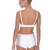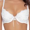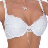 A stunning push-up bra with gorgeous lace and embroidery detailing. Two-section cup feature divided by soft and shiny ribbon. The cups have beautiful mesh with delicate embroidery finished with scalloped lace at the top edge. Inside the cups are removable pads. Between the cups is a thin long bow and lovely lace up detailing which is a great stand out feature for this bra. Ginewra has thick adjustable bra straps which have luxurious ruffled ribbon lace with a small satin bow at the top. Hook and eye feature at the back for adjustment. The wings of the bra are plain with soft and shiny fabric which is incredibly soft to touch finished at the edges with a complementary zig-zag stitch. A perfect bra for bridal wear ticking all the boxes a bride would endeavour for her big day. Matching short is available to order separately on the website. Also available in black/cream. Ginewra arrives packaged in her own Roza box with elegant branded tissue paper inside.