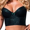 A lovely push up half corset with removable pads and straps. Also ideal for outer wear. Made from black fabric with contrasting turquoise green sparkly effect adding a touch of glamour. A black organza and satin ribbon turquoise green bow decorates the front. The corset has boning at the sides for support and an adjustable 6 hook and eye fastener at the rear with three adjustment positons for comfort and fit. This is a mix and match collection with the thong brief suspender belt and half thong all available separately. PLEASE NOTE: the newer white background images show the bra for illustrative purposes however can be bought separately on the website.