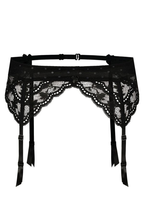 A beautiful suspender belt with a pretty bow in the centre. This suspender belt is decorated with a transparent mesh band with subtle polka dots and gorgeous lace has been used throughout the rest of the suspender belt. The suspender straps are adjustable and finished with ribboning at the ends and metal rubber suspender clasps. Two adjustable parallel elastic bands feature at the back to fasten the suspender belt. This item arrives packaged in a lovely Roza box making it ideal as a gift or special treat. The Lagerta collection comprises of a push up bra, soft cup bra, thong or brief all available in black or white. Each piece is sold separately to maximise the mix and match options. Please see the ‘Related Products’ tab below to see other combinations.