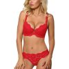 Newia Thong in red (shown in the picture with the push up bra option) is super soft with all over lace at the font and back (excluding gusset). The lace around the top is scalloped to match the push up or soft cup bra options. The thong has a lovey satin ribbon bow and diamante detail at the back. Brief bra and thong options are all sold separately available in four colours and arrive packaged in their own lovely Roza box.