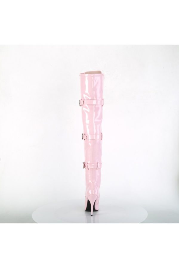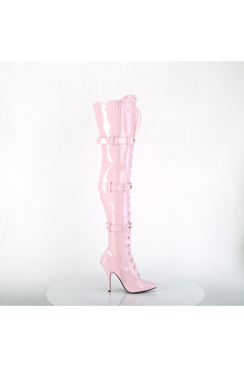 5″” (127mm) Heel Ribbon Lace-Up Front Triple Buckle Strap Stretch Thigh High Boot, Full Inner Side Zip Closure
