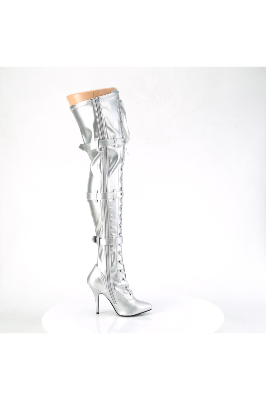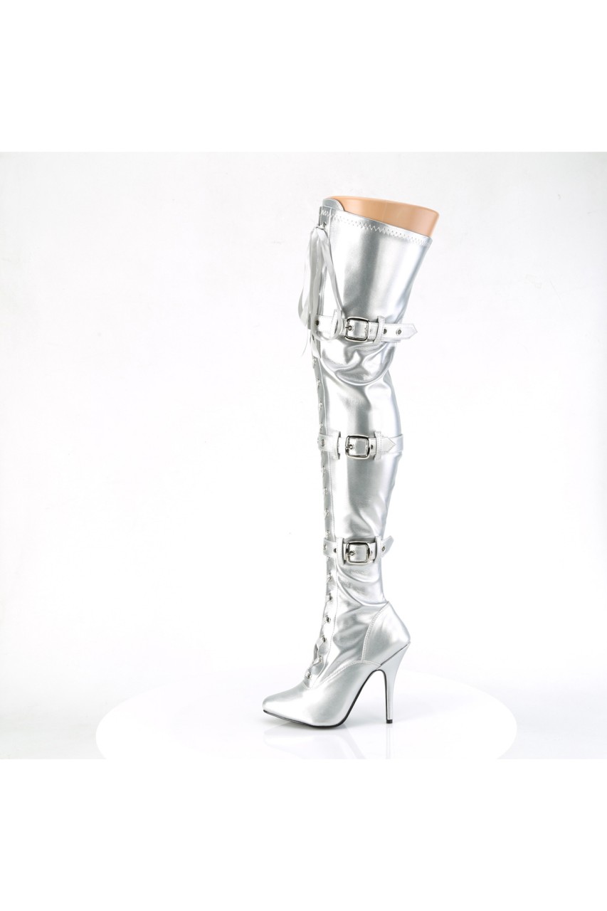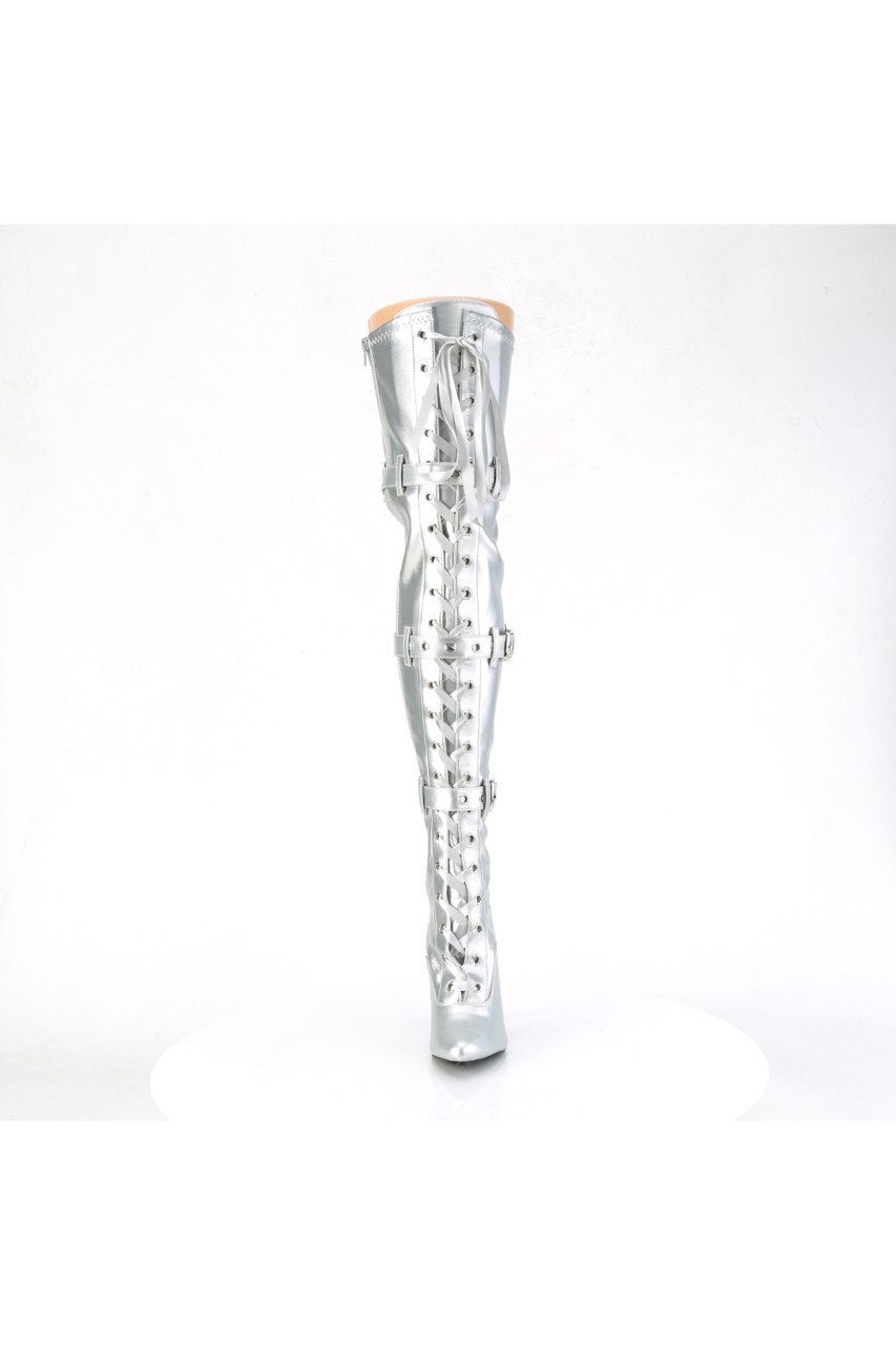 5″” (127mm) Stiletto Heel Ribbon Lace-Up Front Triple Buckle Strap Stretch Thigh High Boot, Full Inner Side Zip Closure
