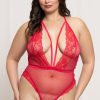 Fence mesh and lace teddy with halter ties, plunging neckling, satin elastic belt, thong back, and snap crotch