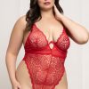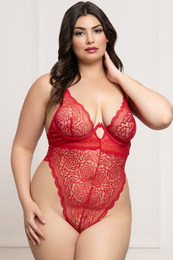 Floral lace teddy with underwire, adjustable straps, gold hardware, high cut leg opening, and thong back