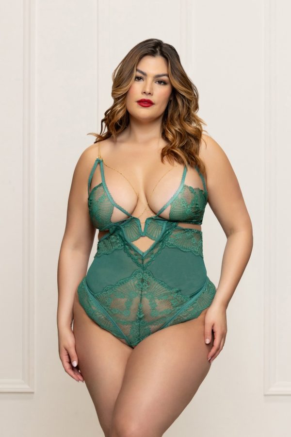 Lace and mesh teddy with gold elastic strap detail, triangle cut out cups, adjustable straps, lace-up back, and open crotch