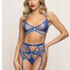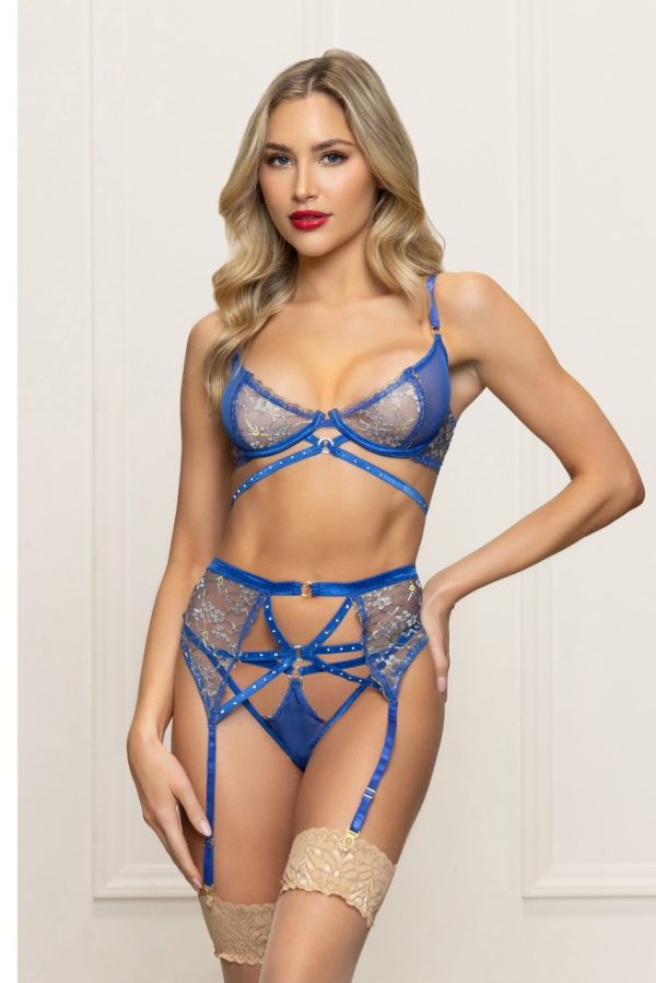 Three piece bra set. Lurex lace and mesh bra with underwire, center front rhinestone rings, strappy waist detail, hook and eye back, gold hardware, garter belt, and g-string